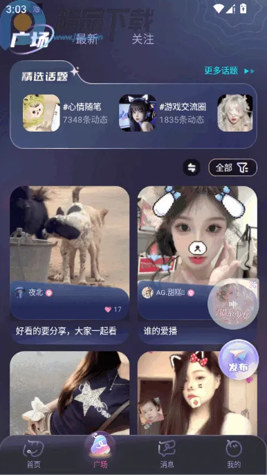 3. 多元话题结识同好,可参与各种热门讨论,分享生活趣事,倾诉内心感受,找到志同道合的伙伴。并且根据用户兴趣爱好自动推荐社群,如二次元、电竞、摄影等,让用户结识更多同好,分享专业知识,拓展社交圈层。