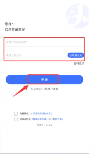 1、启动鑫娱应用,确认服务条款及隐私政策后进入。